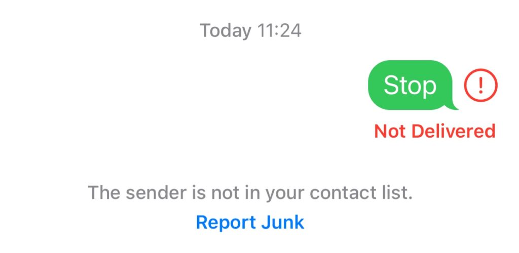 NOTE: You may receive an error stating that your “Stop” request was not delivered (see image below). This is usually because the system is overwhelmed with millions of stop requests — an expected result when sending millions of poor quality unsolicited text messages to people who never requested them. Tap on the red exclamation icon to try again. If after several tries you don’t get a response, it may be because the sender number was spoofed (fake) and not legitimate. Consider reporting the message as junk.