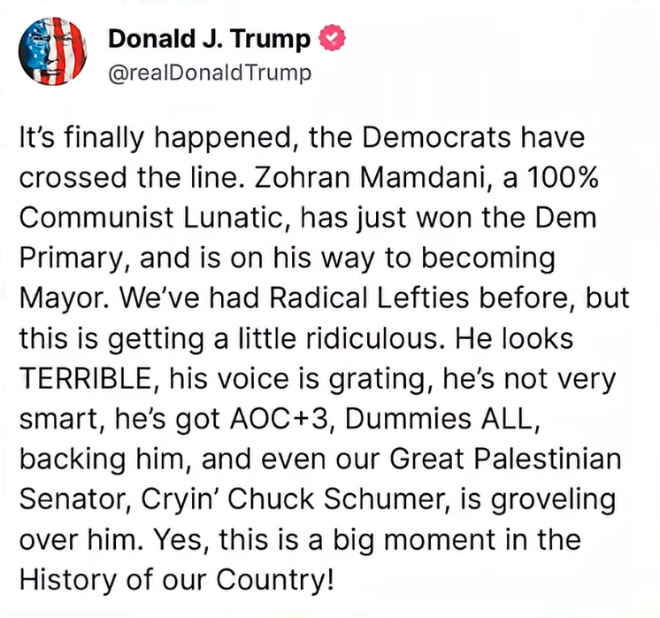 Many politicians on “the left” are not even deemed worthy of receiving derogatory nickname from President Trump. They are viewed as inconsequential. Mamdani has received one of the strongest criticisms (endorsements) ever issued by Trump. The statement is shown below and followed by a translation.