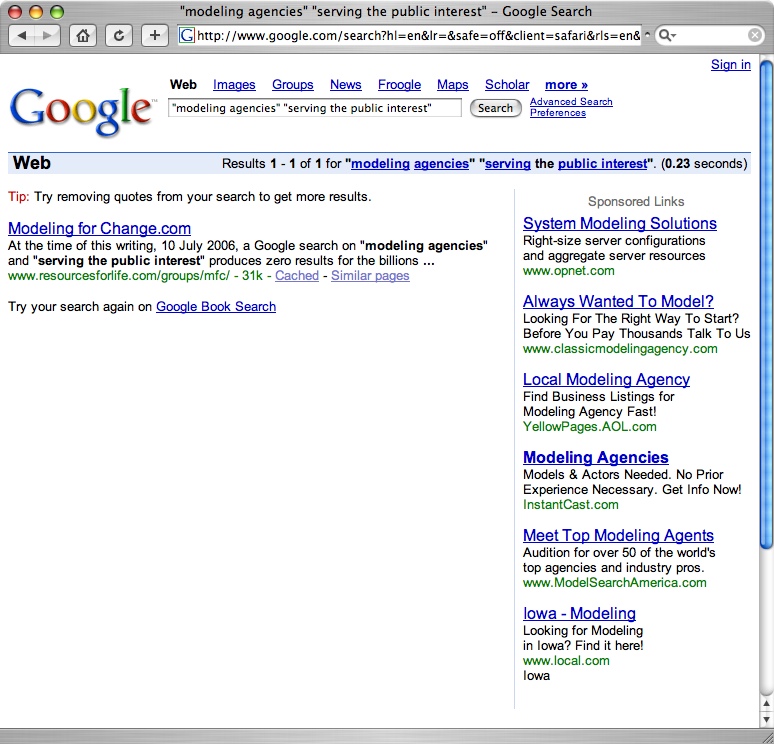 •20060718tu1108. There are billions of web pages searched by Google. At present, Modeling for Change is the only page that shows up on a search for "modeling agencies" and "serving the public interest." [view Google search results as of 20060718tu1108 | view current search results ]